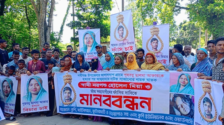 হবিগঞ্জের নবীগঞ্জে গৃহবধু হত্যার অভিযোগে খুনিদের ফাঁসির দাবিতে মানববন্ধন বিক্ষোভ মিছিল ও প্রতিবাদ সভা ৪ গ্রামের উদ্যোগে অনুষ্ঠিত হয়েছে।
