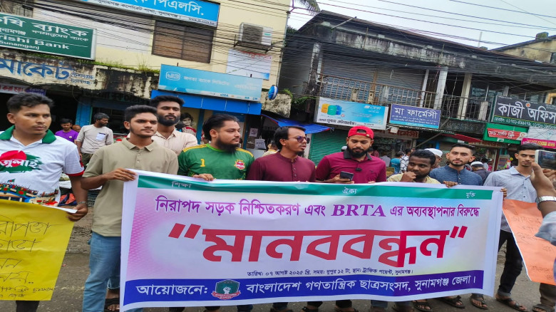 নিরাপদ সড়ক নিশ্চিত করা এবং বিআরটিএ’র দুর্নীতি ও অব্যবস্থাপনার বিরুদ্ধে মানববন্ধন করেছে বাংলাদেশ গণতান্ত্রিক ছাত্রসংসদ সুনামগঞ্জ জেলা শাখা।